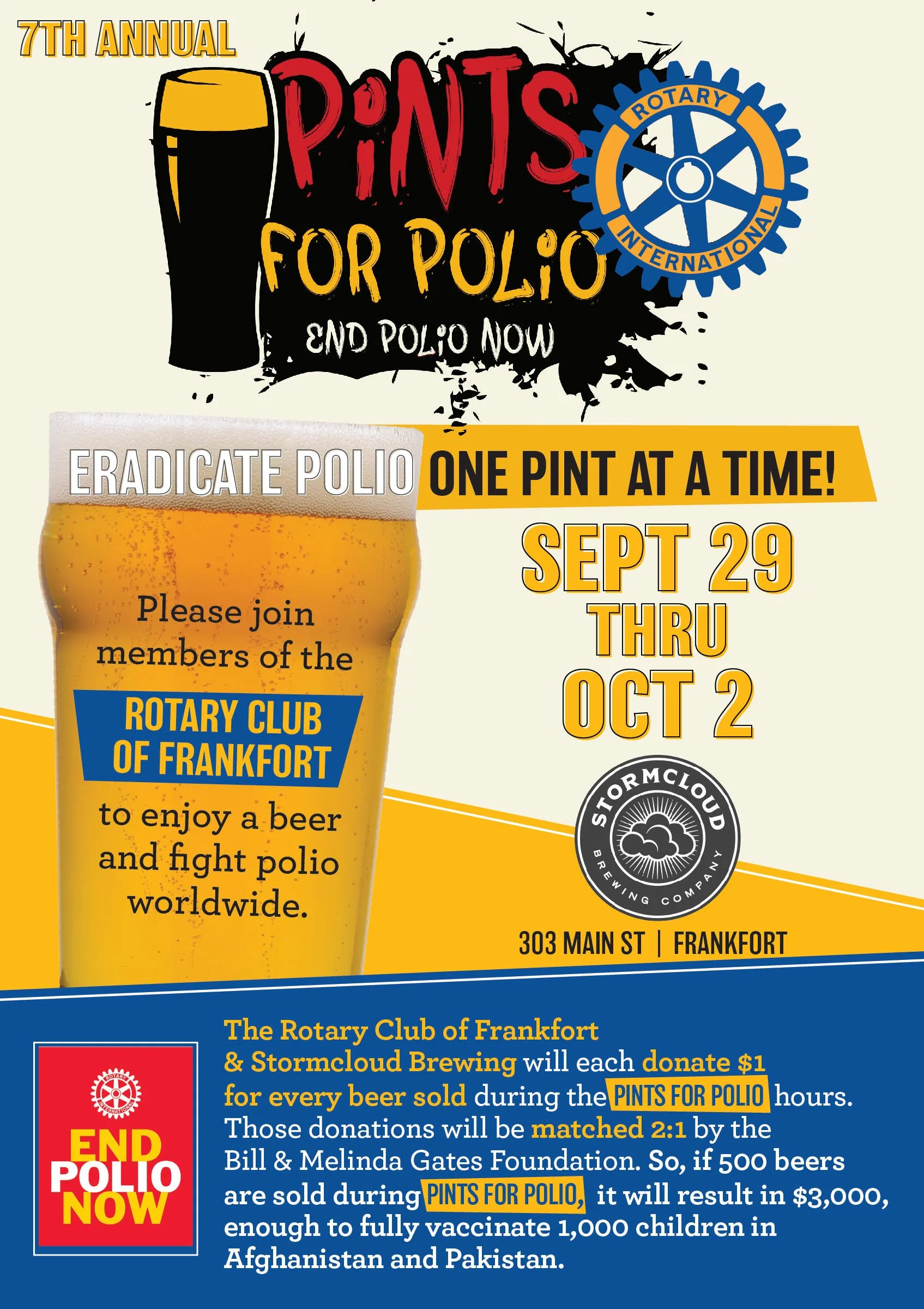 This is the Frankfort Rotary Club’s 7th Annual Pints for Polio event. The Rotary Club of Frankfort and Stormcloud Brewing will each donate $1 for every beer sold during the Pints for Polio hours.